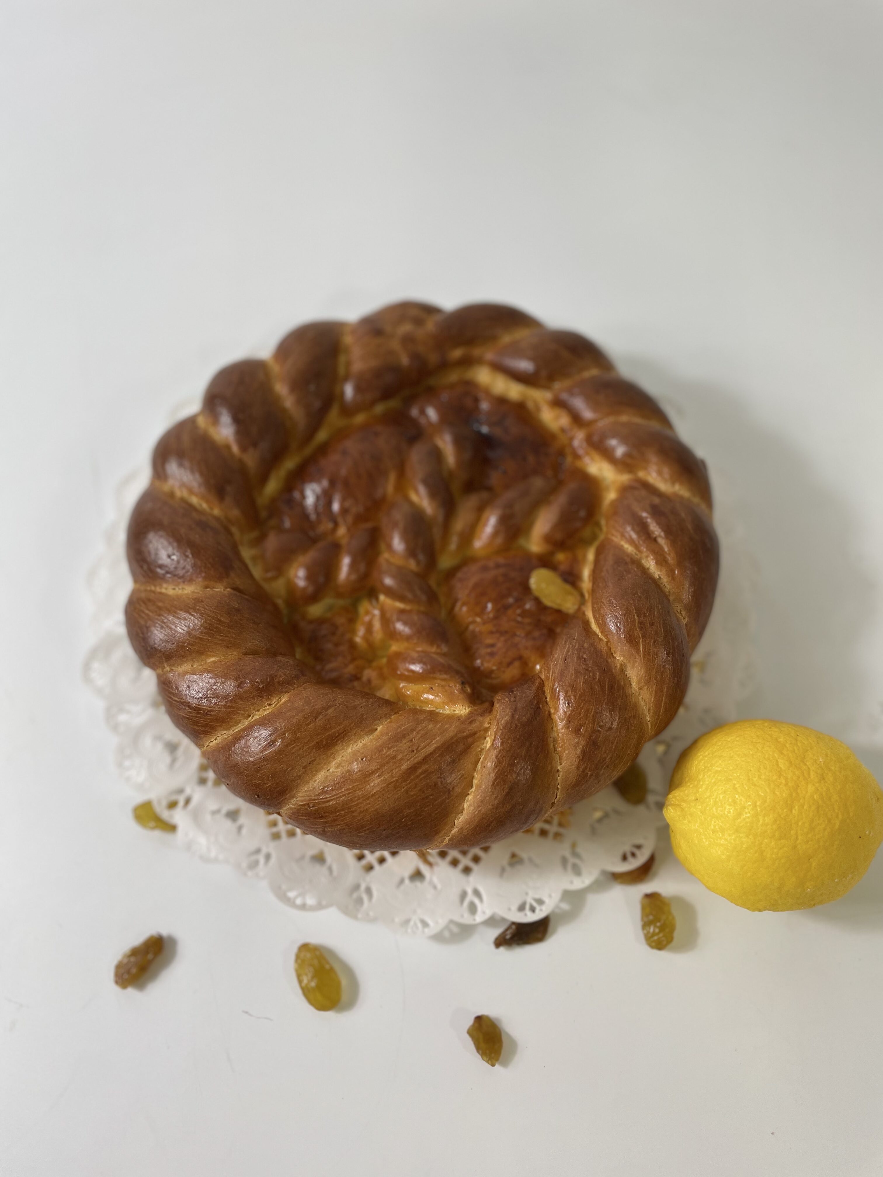 Une brioche dorée et aérienne, à la mie filante et légèrement beurrée, délicatement parfumée à la vanille et aux zestes de citron. Cette version épurée de la spécialité traditionnelle de Pâques séduit par sa douceur naturelle et sa texture moelleuse, où la pâte briochée révèle toute sa richesse sans garniture.