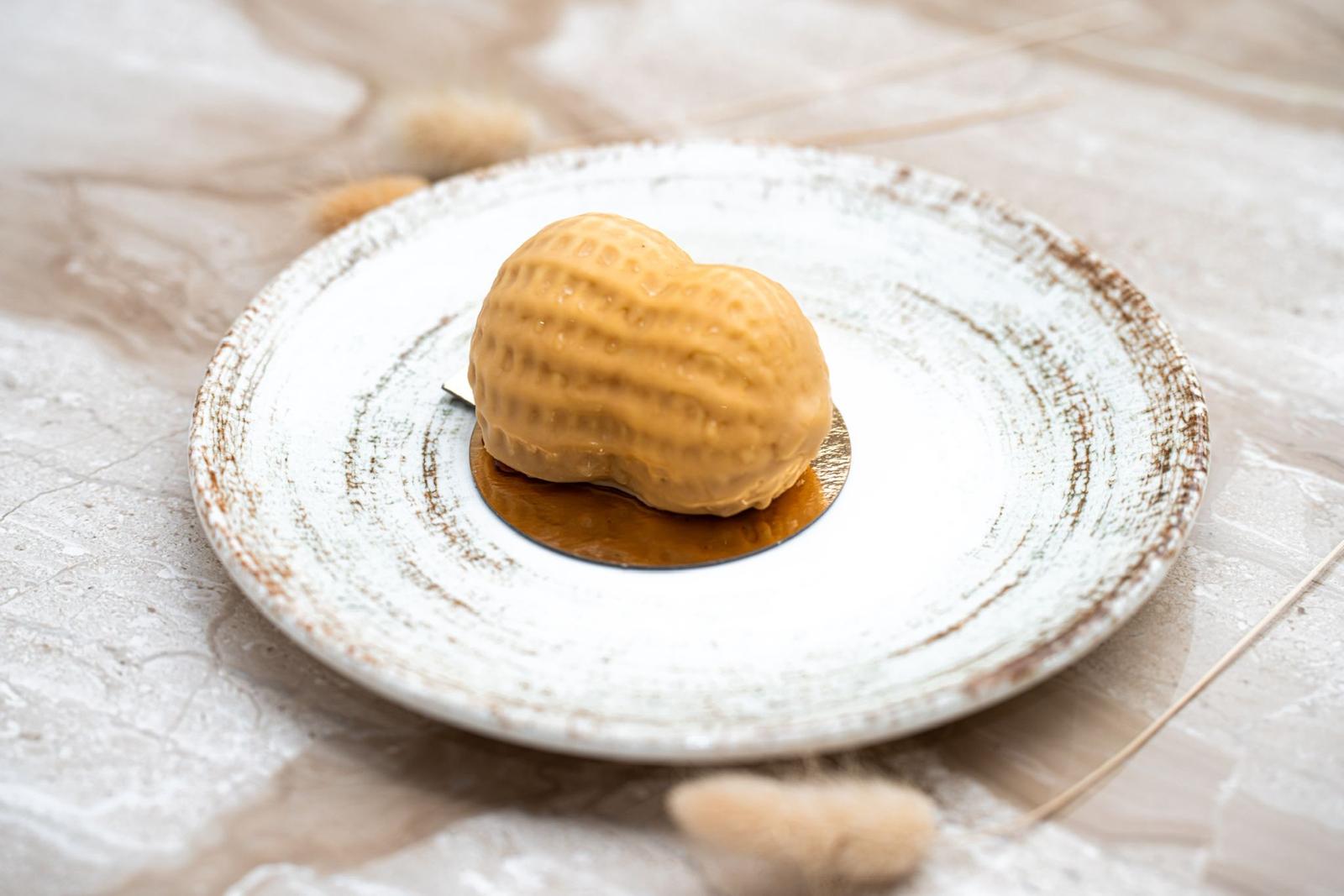 L’illusion parfaite pour les amateurs de saveurs contrastées. Ce trompe-l’œil cache sous sa coque un praliné cacahuète maison ultra-croquant et une mousse onctueuse. Le mariage du chocolat et de la cacahuète grillée, relevé d’une pointe de fleur de sel, crée un équilibre irrésistible entre force et gourmandise.