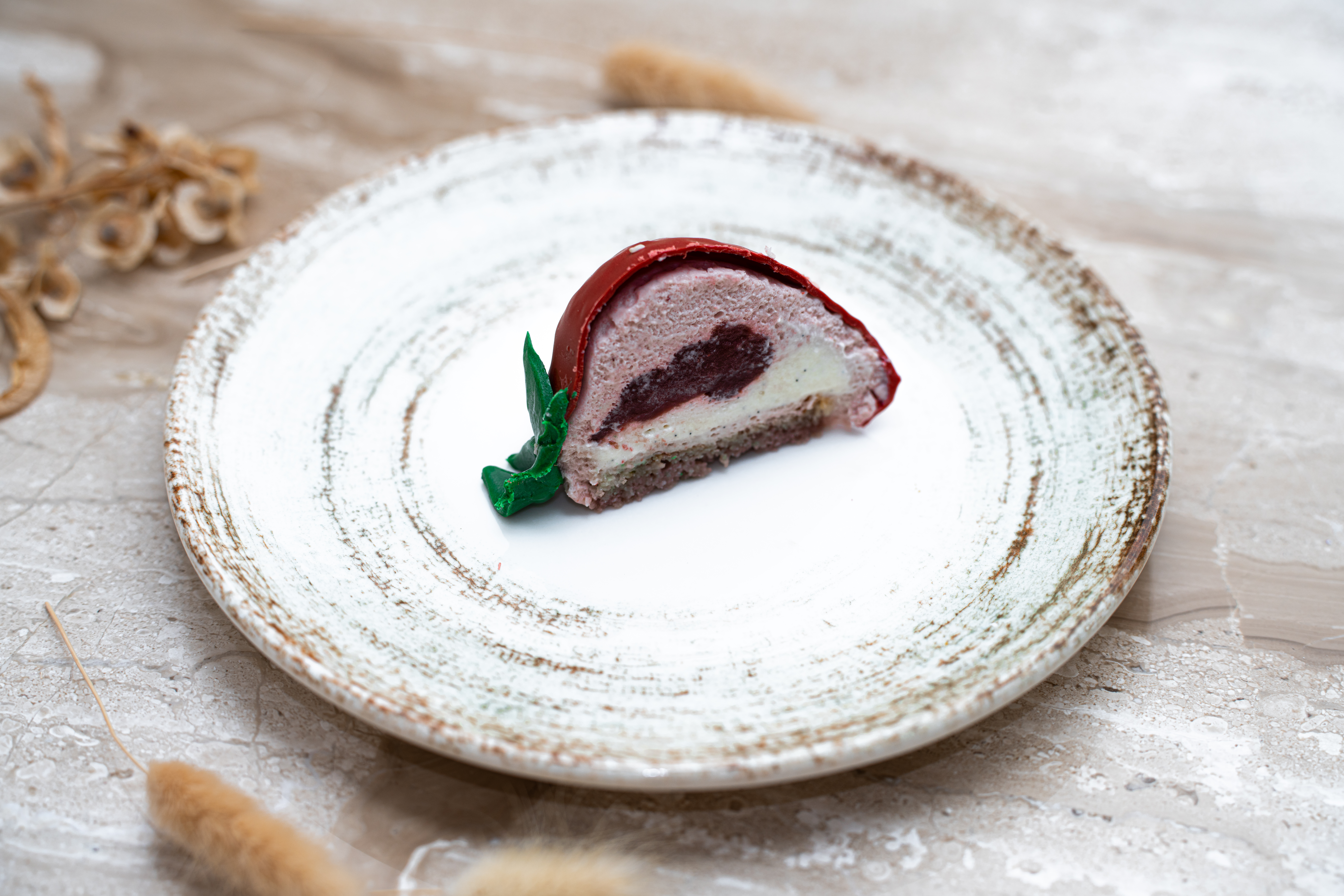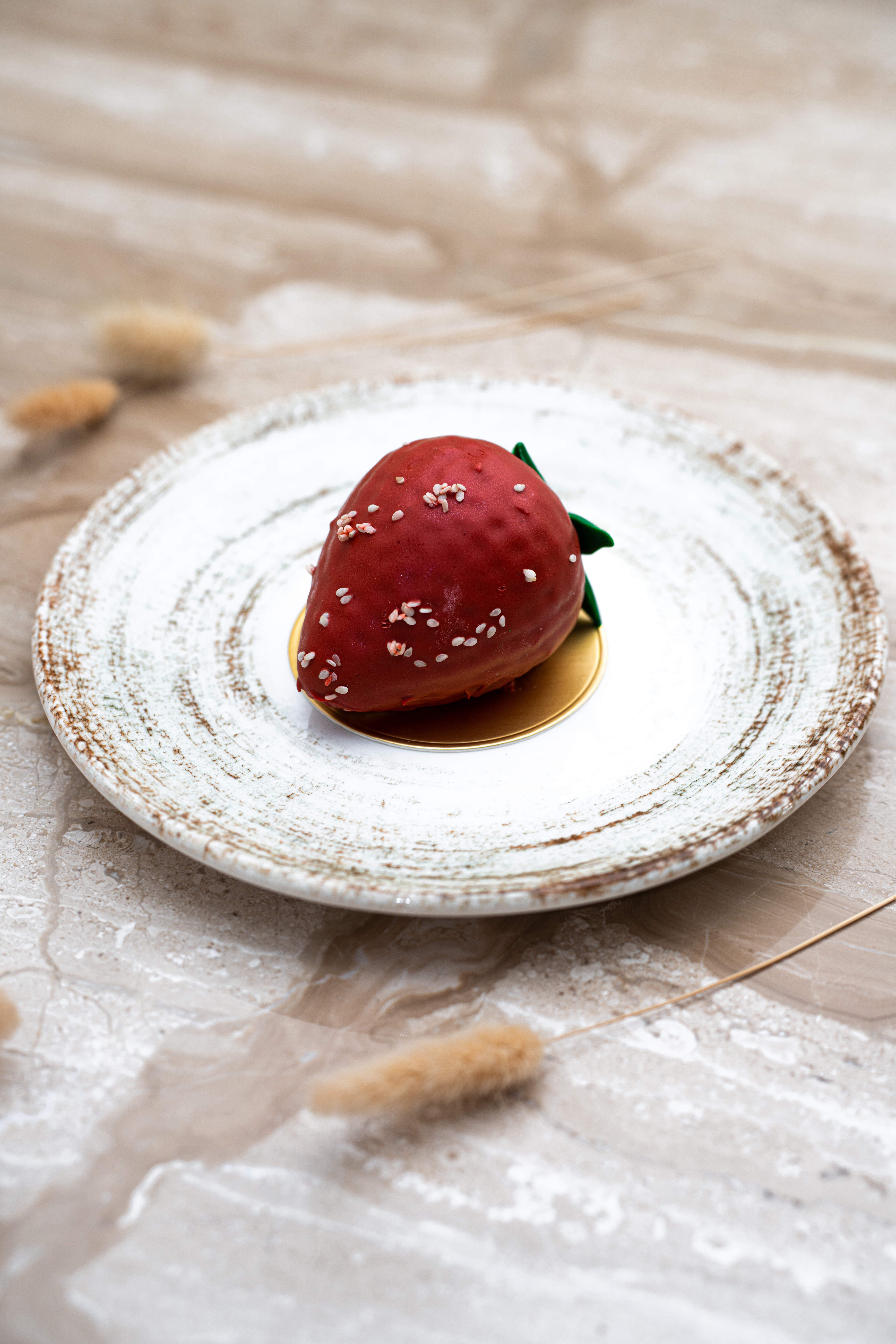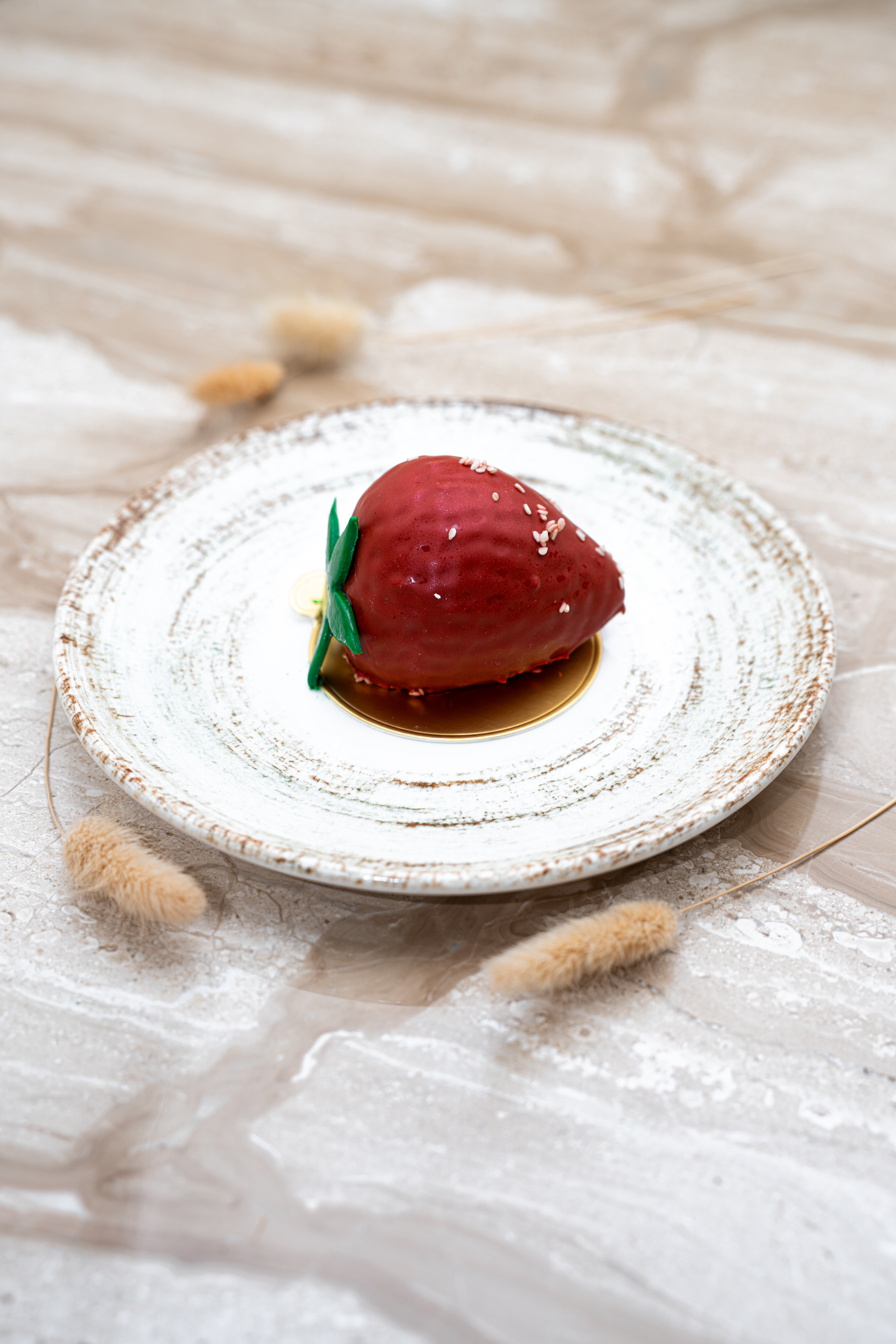 Sous la forme d’une fraise, ce dessert révèle une ganache montée à la fraise, un coulis frais et un biscuit sablé croquant. À chaque bouchée, savourez la puissance du fruit et l’élégance d’un visuel bluffant, pour un plaisir haute couture.