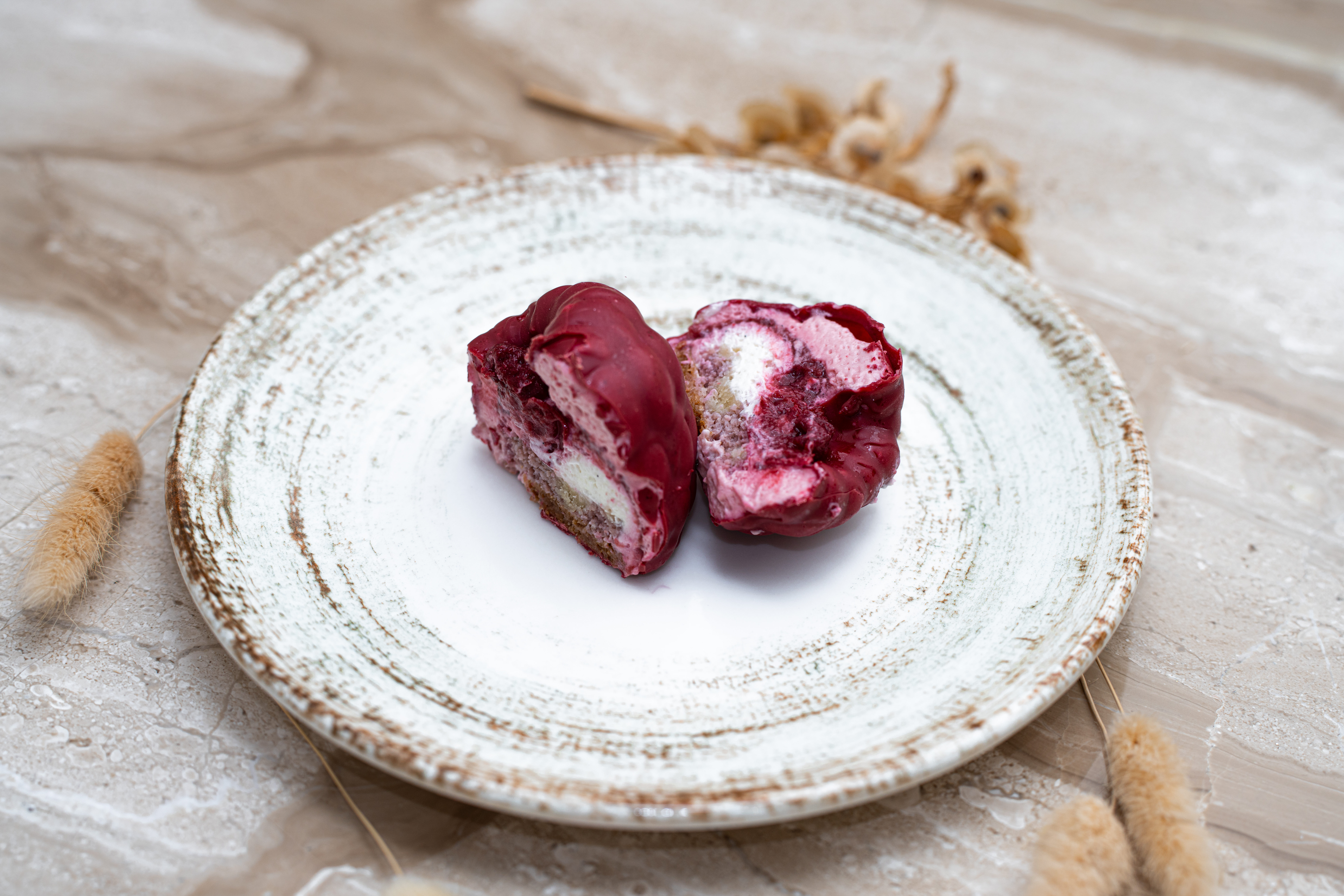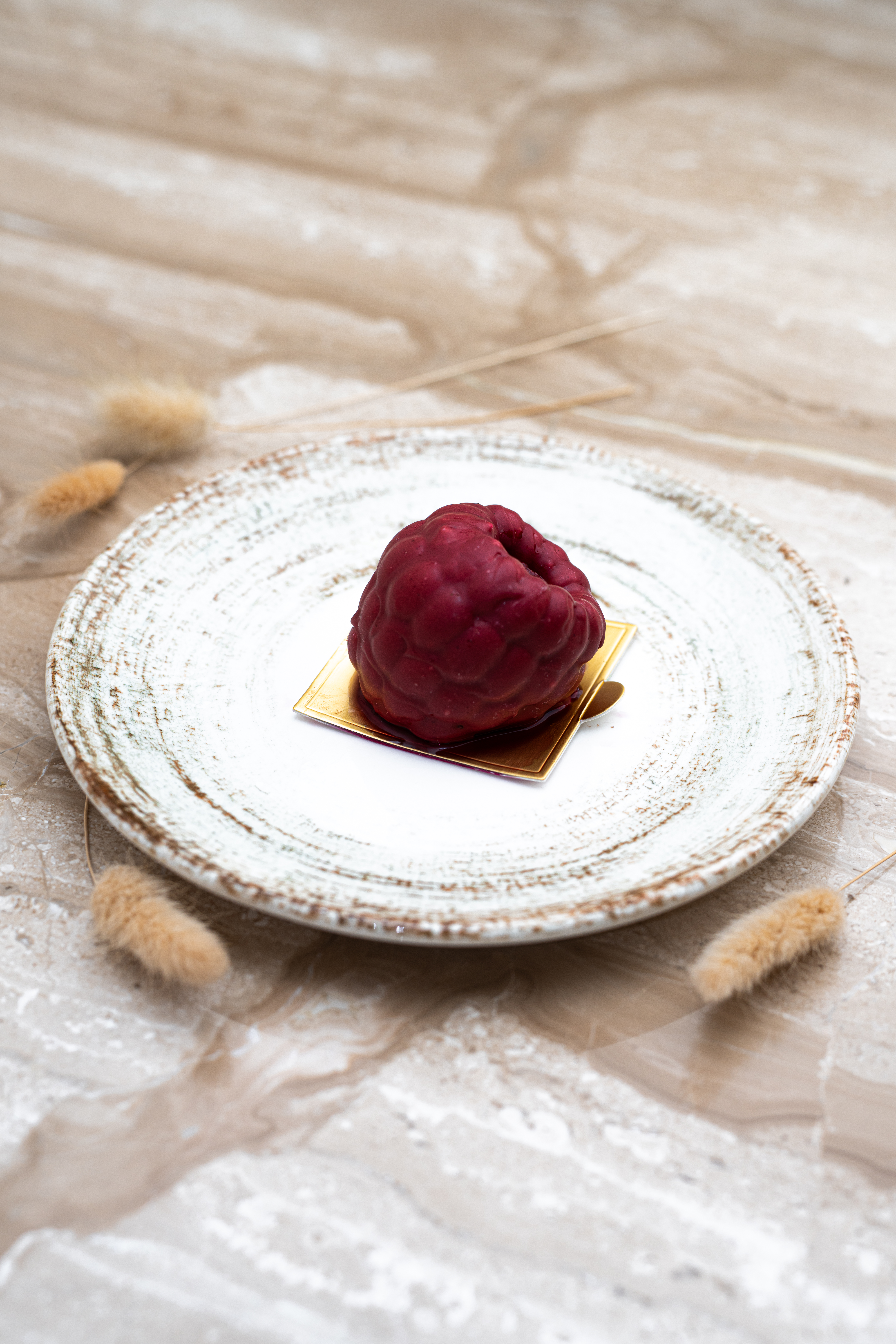 Ce dessert combine l’acidité de la framboise et la douceur d’une ganache, sur une base de biscuit dacquoise à la vanille. Chaque création est un clin d’œil artistique et fruité, à la fois surprenante et raffinée.
