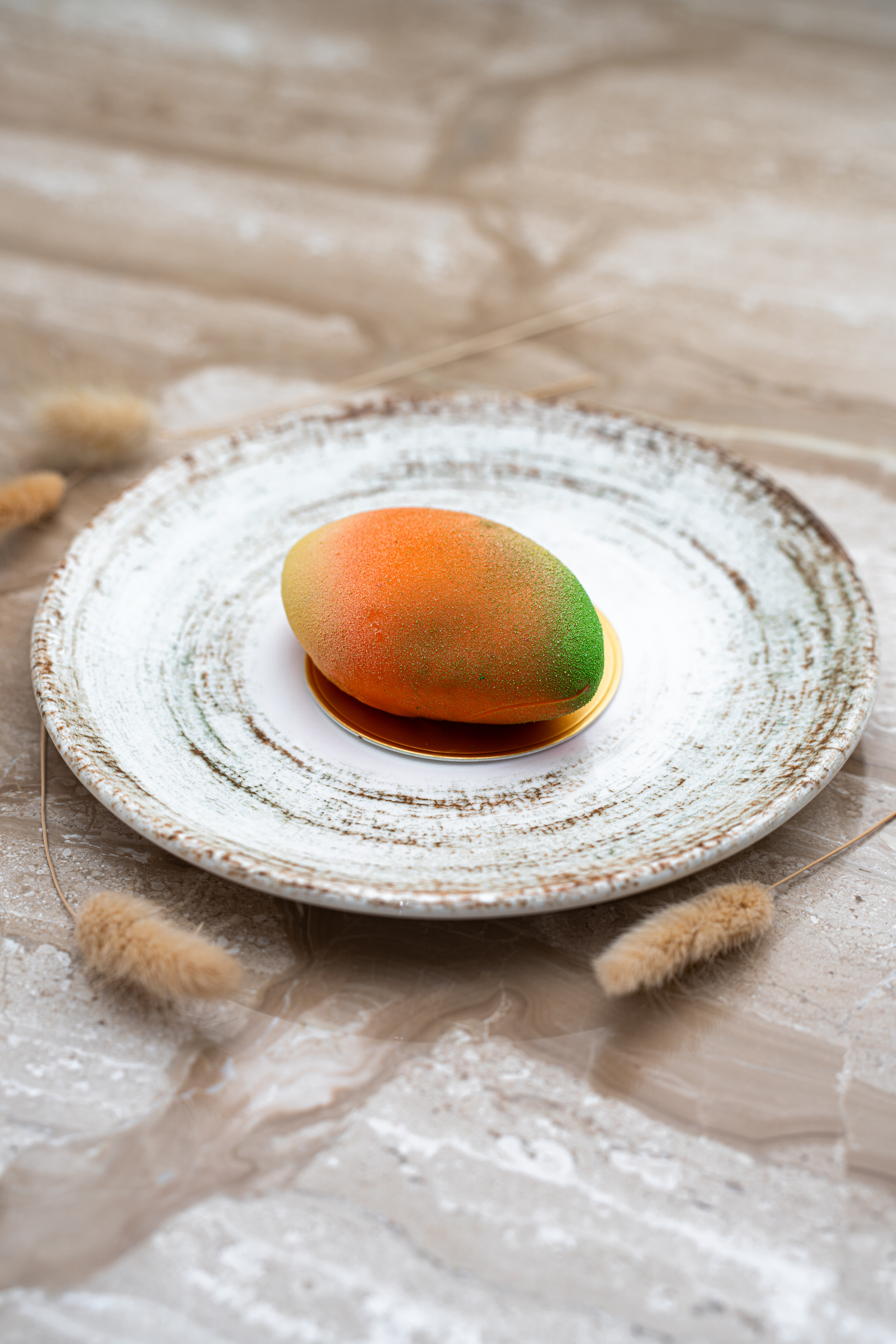 Composition : ganache montée à la vanille, compotée de mangue, biscuit sablé.